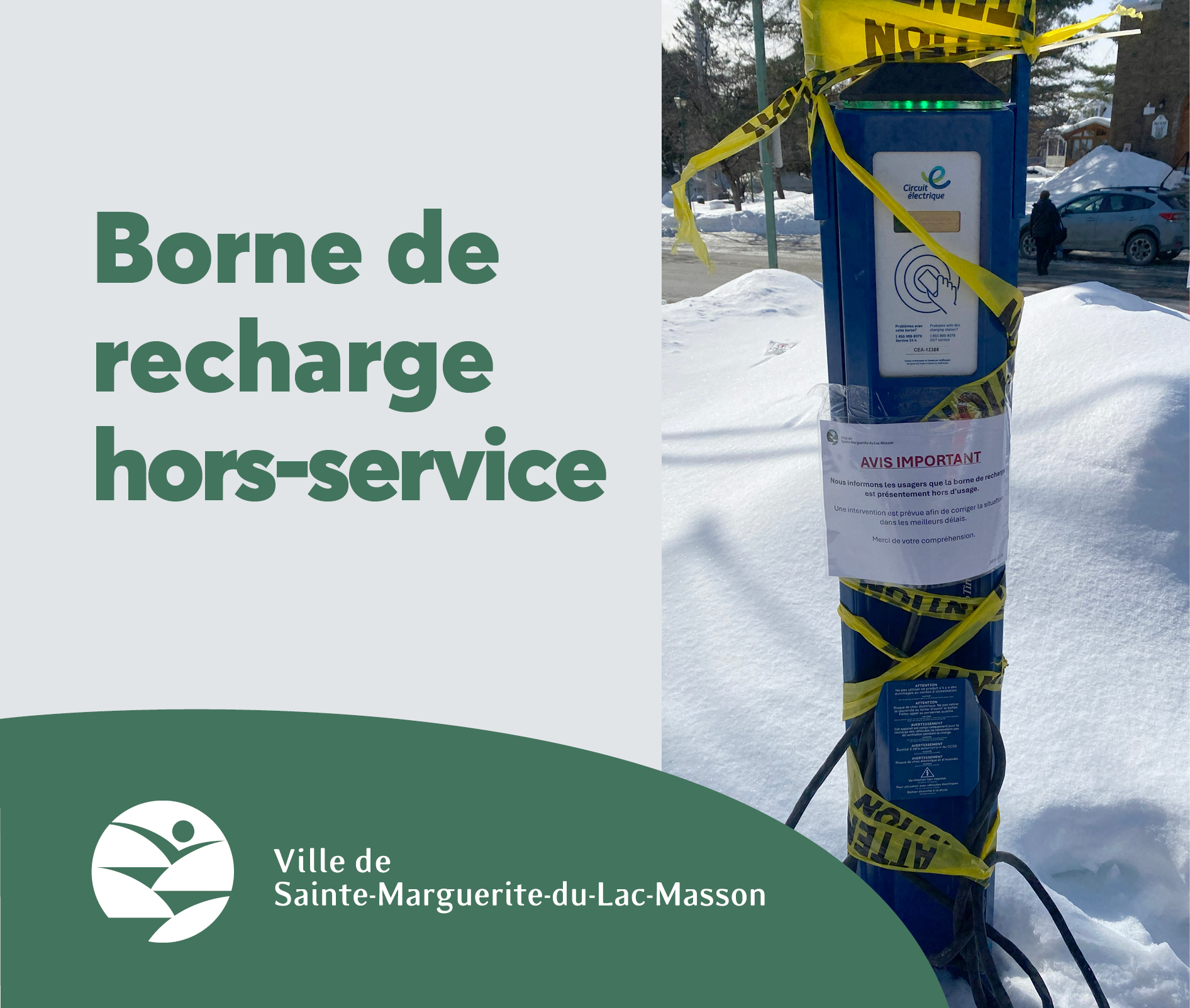La Ville de Sainte-Marguerite-du-Lac-Masson informe la population que la borne de recharge pour véhicules électriques est présentement hors d’usage. Une intervention est déjà prévue afin de corriger la situation dans les meilleurs délais et de rétablir le service dès que possible. Nous remercions les usagers de leur compréhension.
