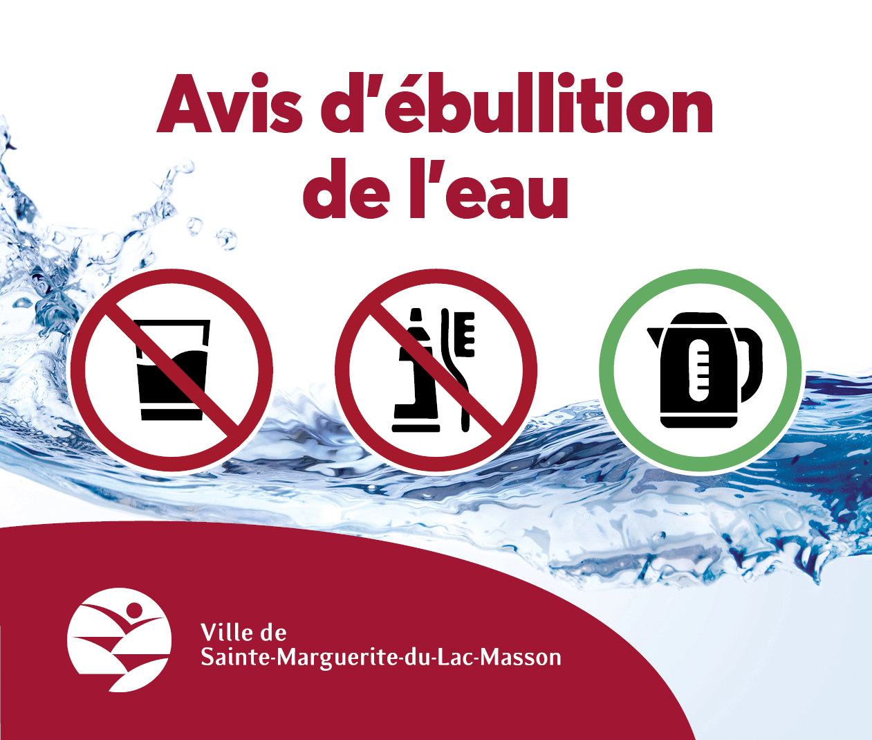 Un avis d'ébullition de l'eau est actuellement en vigueur à la suite d'un bris d'aqueduc dans le secteur du chemin Sainte-Marguerite entre les adresses 159 et 350, incluant les chemins desservis des deux côtés de ce tronçon.