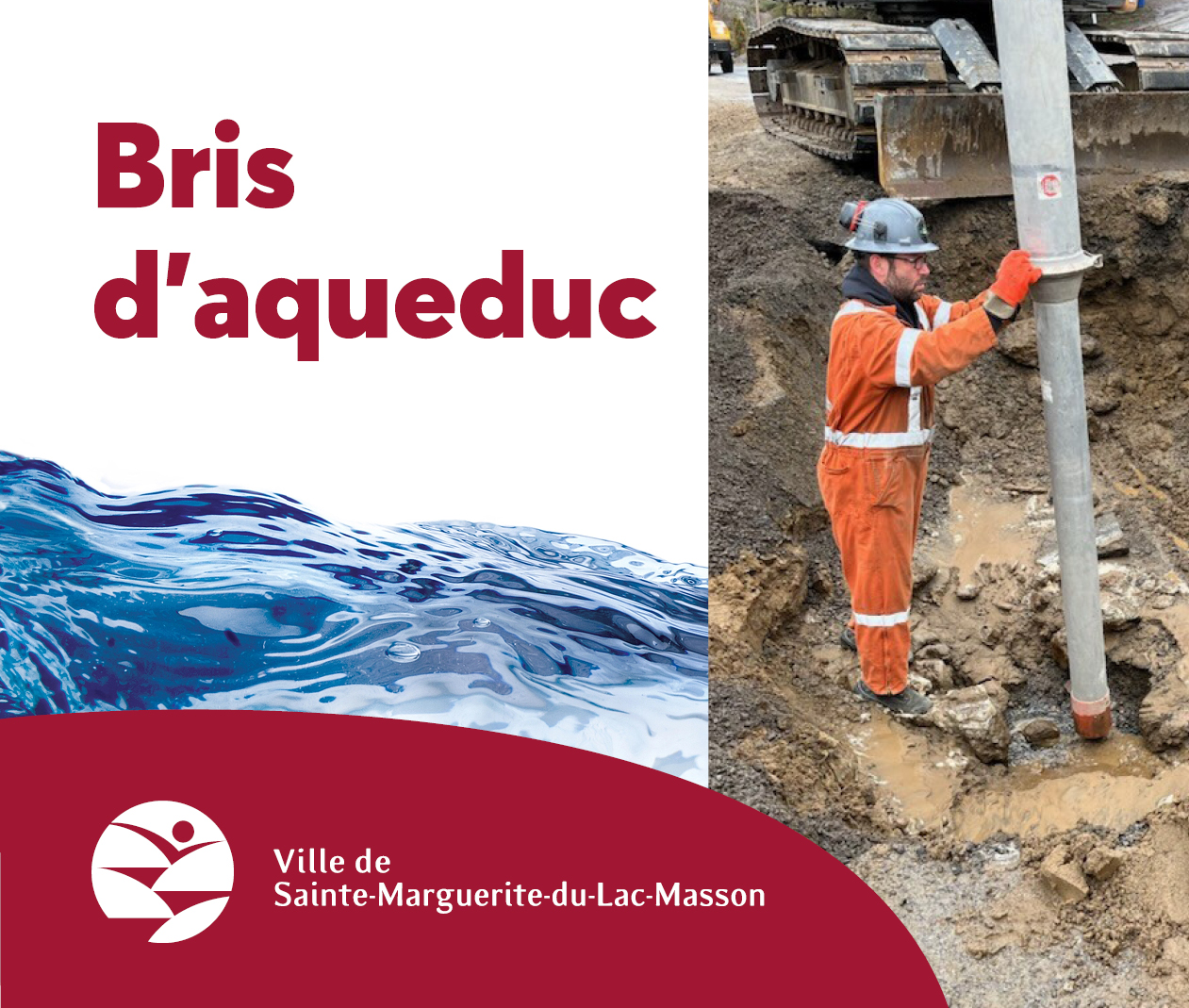 Prenez note que des travaux d'urgence sont en cours afin de réparer un bris d'aqueduc dans le secteur du chemin Sainte-Marguerite entre les adresses 159 et 350, incluant les chemins desservis des deux côtés de ce tronçon. Le Service des travaux publics est dans l'obligation d'interrompre temporairement l'alimentation en eau pour permettre la réalisation des travaux. Le délai des travaux a été retardé en raison de la météo non favorable.