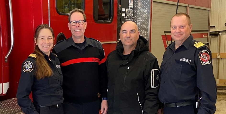 De gauche à droite : Rachel Charland, coordonnatrice adjointe, Christian Brouillet, capitaine, Normand St-Pierre, du Projet Tela Bomberos, et Mario Nareau, directeur du Service de sécurité incendie.