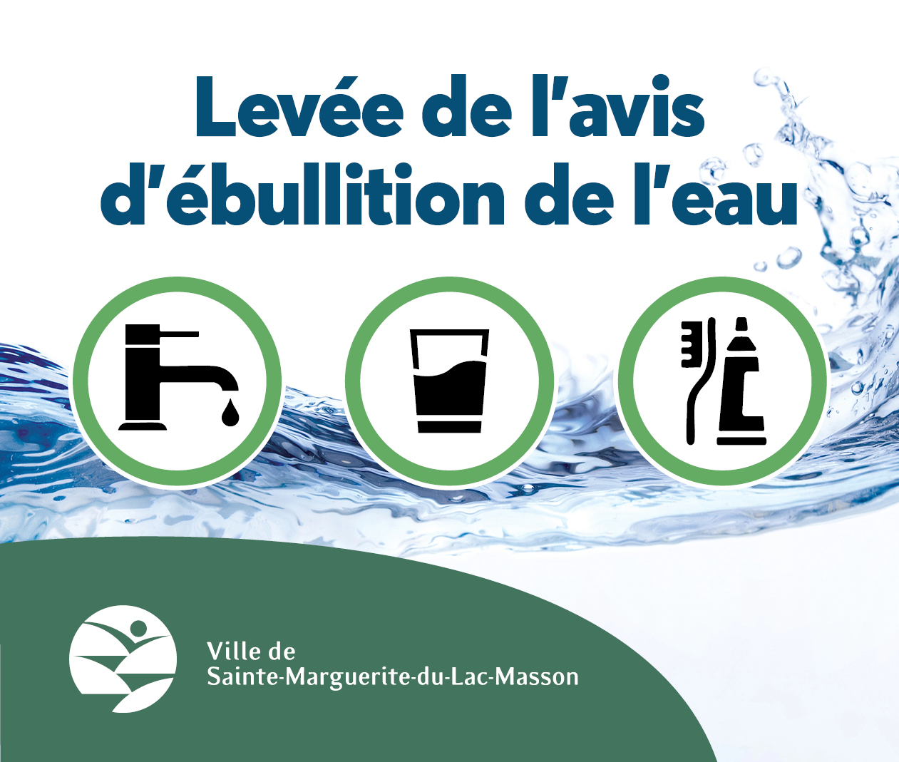 À la suite des travaux réalisés sur le réseau d'aqueduc et des analyses de qualité effectuées conformément aux normes en vigueur, le service des travaux publics de la Ville vous informe que l'avis d'ébullition est maintenant levé pour le secteur du chemin Sainte-Marguerite entre les adresses 159 et 350, incluant les chemins desservis des deux côtés de ce tronçon.