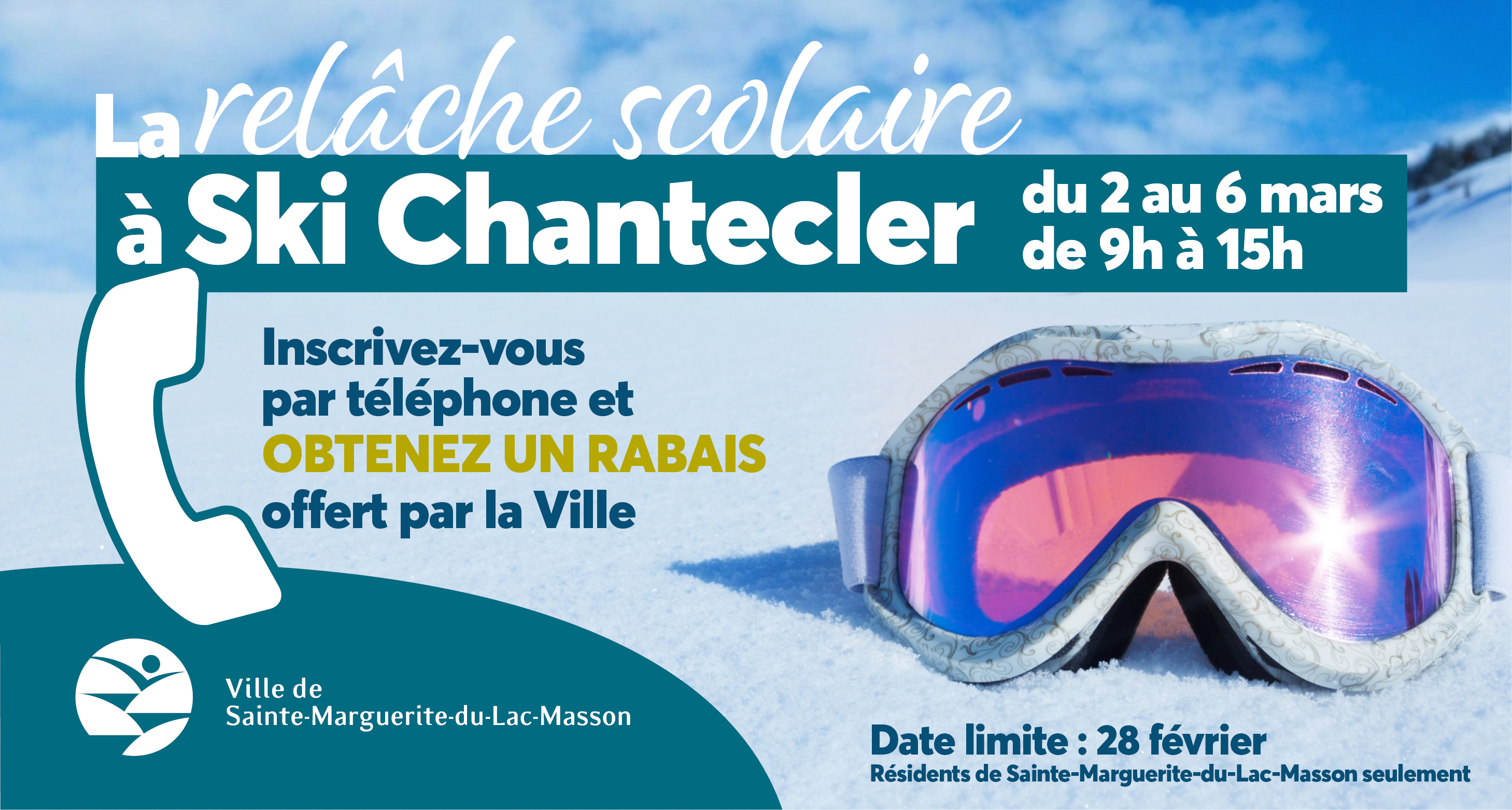 La Ville de Sainte-Marguerite-du-Lac-Masson est heureuse d’offrir aux familles une occasion de profiter de la relâche scolaire à Ski Chantecler, du 2 au 6 mars, de 9 h à 15 h.