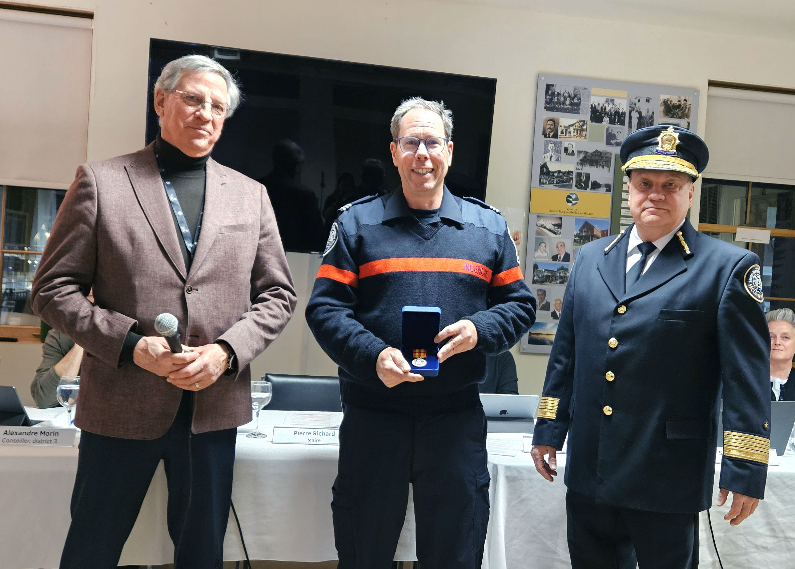 Pierre Richard, maire de la Ville de Sainte-Marguerite-du-Lac-Masson et président de l’Agglomération Sainte-Marguerite-Estérel, Christian Brouillet, capitaine et pompier au sein du service incendie et Mario Nareau, directeur du service de la sécurité incendie et civile.